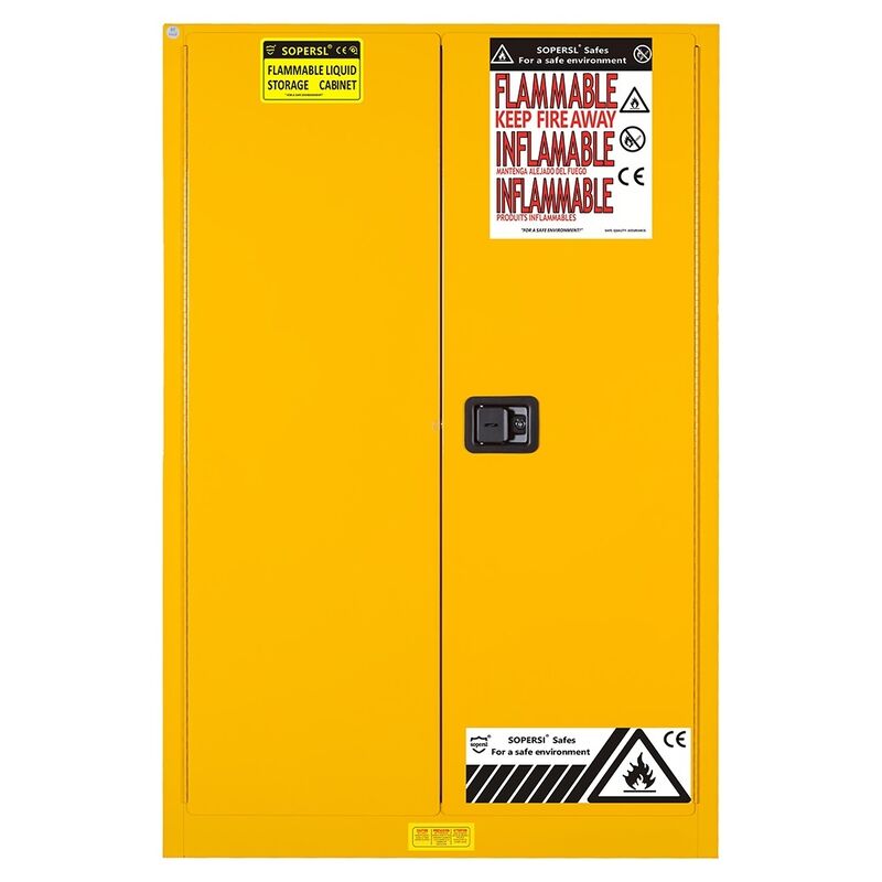 The SUPER 45-Gallon Flammable Safety Cabinet (170L capacity) is designed for compliant storage of Class I, II, and III flammable liquids. Featuring 16-gauge double-wall steel construction, 38mm insulating air space, dual 2-inch flash arrestor vents, and a 2-inch spill containment sump, it meets NFPA 30 and OSHA 1910.106 standards.